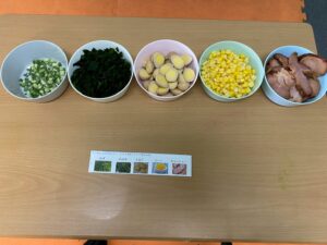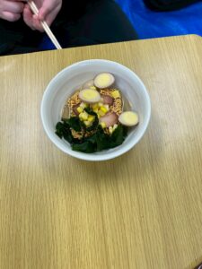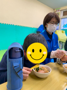 お買い物学習で大人気の東京ラーメンに今回はトッピングをしたおやつレクリエーション。