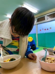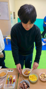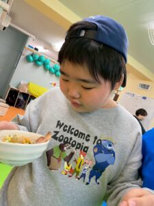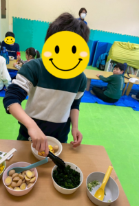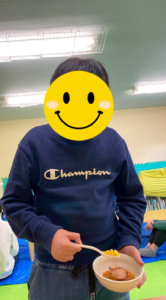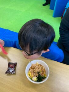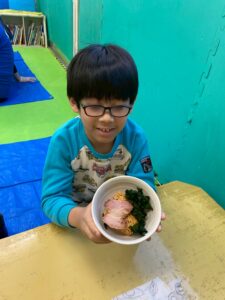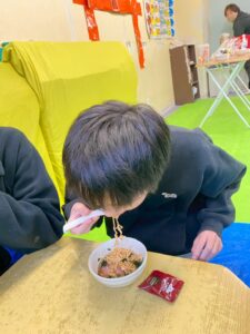 お買い物学習で大人気の東京ラーメンに今回はトッピングをしたおやつレクリエーション。