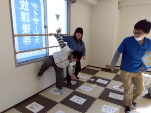 人間スゴロクでは、からだを使ったり、動物のものまねをしたり