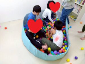リラックスする子、ボールをパシャパシャする子、それぞれの楽しみ方で過ごしています。