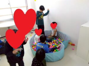 リラックスする子、ボールをパシャパシャする子、それぞれの楽しみ方で過ごしています。