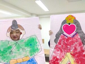先週工作で子供たちが作ったお雛様とお内裏様に顔をはめて写真を撮りました。