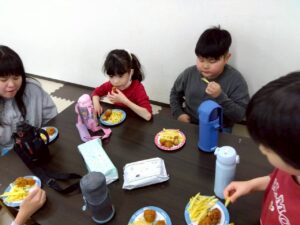 ソーセージや野菜を炒めるのを手伝ってくれた児童もいました。