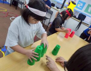 けんけんぱをした後に、机に置かれたカップをピラミッド状に積み重ね、その後元に戻し、けんけんぱで戻ります。