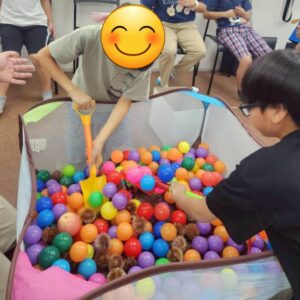 アンパンマンの知育玉入れ玩具を用いて、かごを目指してボールを飛ばしていきます。