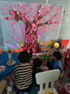 満開に綺麗に咲いた桜壁面を見て、一人の児童から「せんせい~!!ここでおやつを食べてお花見をしようよ♪」と、楽しい提案をしてくれたので今日は、お部屋にマットを敷いてみんなでおやつ時間も楽しむことができました😄✨✨