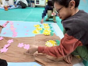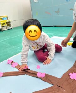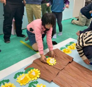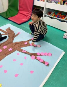 最後は、みんなで桜やたんぽぽをパネルに貼り付けていきます。「ここに貼ろう!」「こっちの方がきれいかも!」と相談しながら、協力して仕上げてくれました。