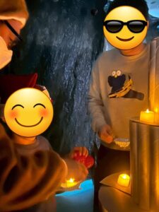 暗い部屋に用意されているタワーにキャンドルをひとりひとり置き、
