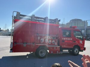 目の前を列になって大きなはしご車やたくさんの消防車両の行進を見て、手を振りながら喜ぶ子ども達でした。