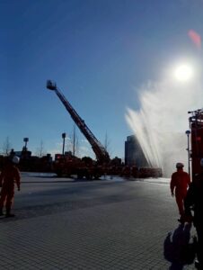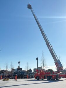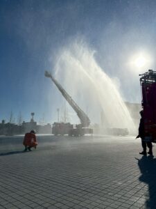 最後に迫力満点の一斉放水では風向きがちょうどライズの子ども達が見学している方向へふいて、水しぶきから一斉に逃げ回る場面も楽しいひと時となりました。