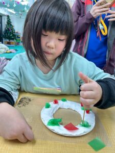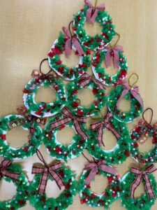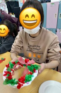 その後はリボンやカラフルなモールを飾り、とても可愛らしいクリスマスリースが出来上がりました。
