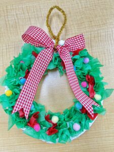 今日は紙粘土と花紙を使って、かわいらしいクリスマスリースを作りました。