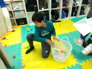 転がったたくさんのボールを拾い集める