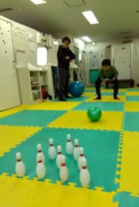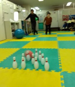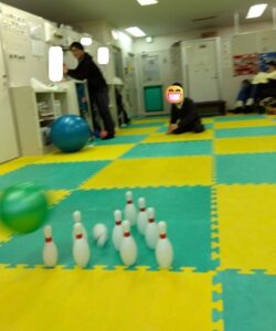 遠くにあるピンめがけて倒す運動療育です!