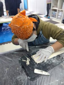 踏んだら生地を折り返してまたよく踏んでを繰り返していきます。