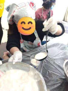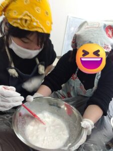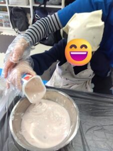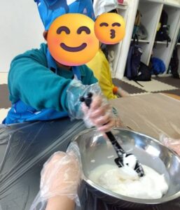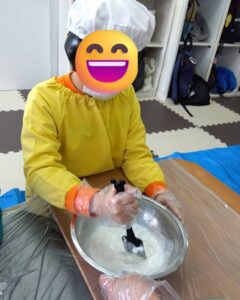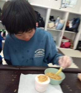 今日のレクは二班に分かれて午前中に材料を混ぜる、カップに入れる、