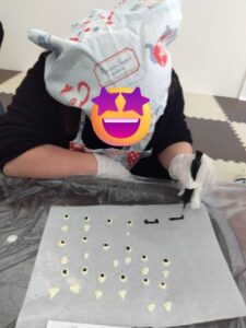 チョコスティックで鬼の目や口、角を作る作業を行いました。