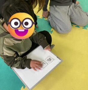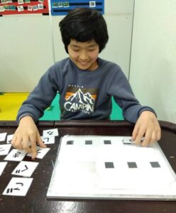 この活動では、文字を見て考え、言葉を組み立てる