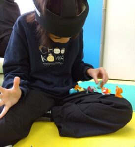 児童二人でペアを作りバンダナを持って手を離さない様に