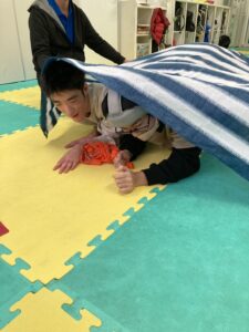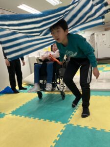 ペアの児童と協力して障害物を乗り越えてゴールを目指しました!