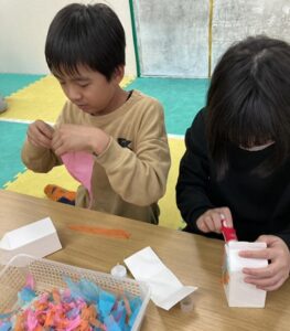今日は「牛乳パックランタン作り」を