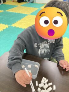 現物課題では、「ボタンの紐通し」や「お箸トレーニング」を行いました。