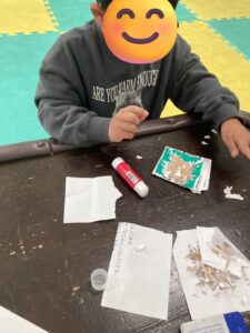 指先でちぎり、糊を使って牛乳パック
