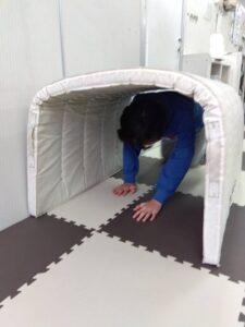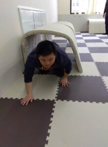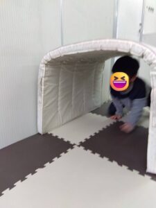 今週の運動療育は「マットトンネルくぐりゲーム」です。