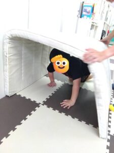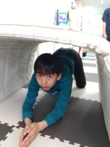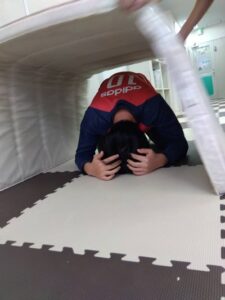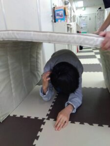 子どもたちは机の下やマット、座布団で