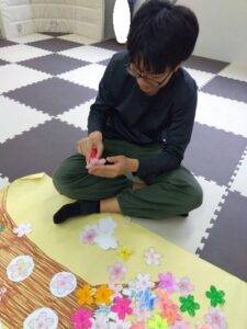 桜の花に色を塗り、木の枝にペタペタと貼り付けます。