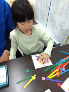 まずは「青を2個おいてから赤を3個おく」といった順番で行動する課題に取り組み、