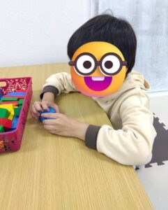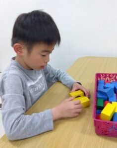 たくさんの積み木から言われた積み木を置いていく課題であり、「話を聞くこと」を目標としています。