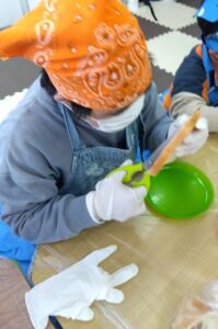 皮をむく、塗る、巻くといった作業は、指先を細かく使う良い練習になります。
