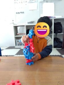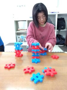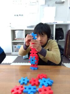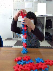 午後は、室内レク「ブロック積みゲーム」に取り組みました。