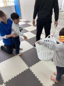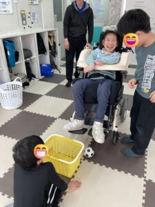 → 強すぎるとカゴを越えてしまい、弱すぎると届かないため、ちょうどよい力で投げる練習になります。また、受ける側もボールの動きに合わせて体やカゴを動かすことで、身体のコントロール力が養われます。