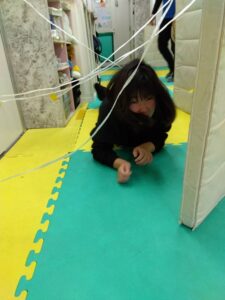テープを蜘蛛の巣に見立てて、ひっかからないようにくぐりぬけたり、
