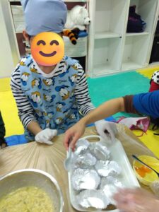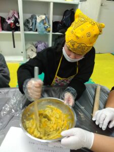 みんなでさつまいもをつぶして、スイートポテト作りをしました。