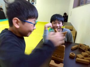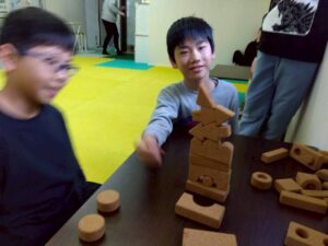 コルクの積み木を高く積み上げていき、倒したらお掃除のお手伝いをするというルールで遊びました!