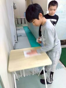 結果はみんな1敗ずつして、仲良くドアノブ消毒、テーブル拭き、流しの掃除をしていました(笑)