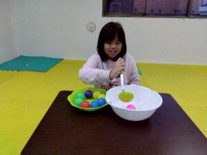 器からボールをすくおうとすると外に転がり落ちてしまうこともあり、落ちないように反対の手で器を少し斜めにして工夫している子もいました👏