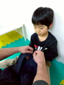 上着のファスナーを自分で「差し込む・引き上げる」練習を行いました。