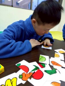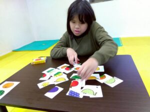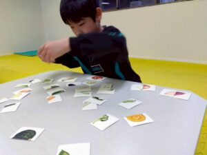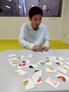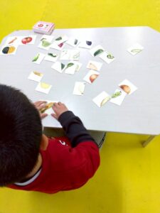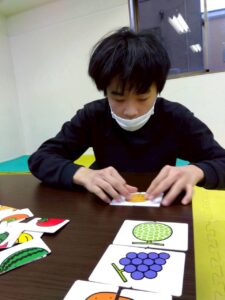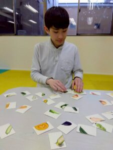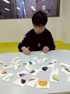 乗り物や果物など、絵が半分ずつ描かれたカードを見比べながら、同じ絵になるように組み合わせていきます。