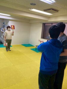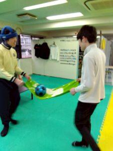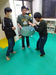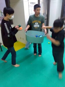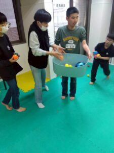 自分のペースで進んでしまうとすぐにボールが落ちてしまうので、協力して運びましょう!