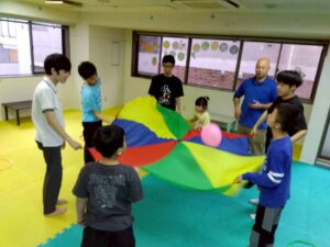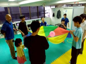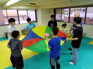 3分間という時間の中で、できるだけパラバルーンの上のボールや風船を落とさない、というルールで取り組みました!