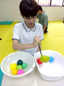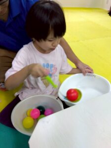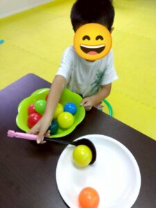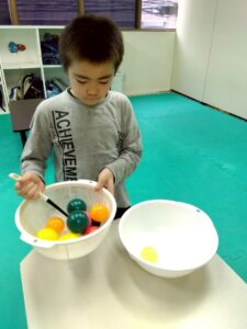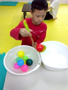 たくさんあるカラーボールを、おたまですくって隣の器に移動させます!