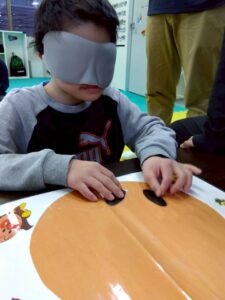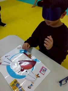 また、福笑いにも挑戦しました。目隠しをして、手の感覚だけを頼りに顔のパーツを配置します。