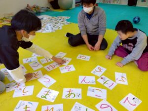 カルタ遊びでは、職員の声をよく聞きながら、ひらがなカードを一生懸命探す姿が見られました。