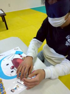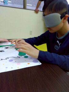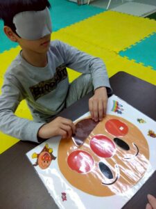 また、福笑いにも挑戦しました。目隠しをして、手の感覚だけを頼りに顔のパーツを配置します。