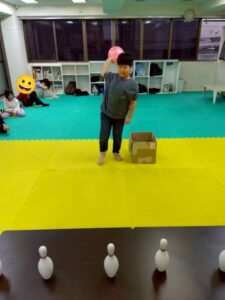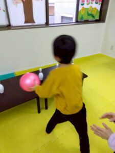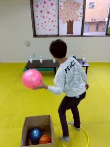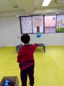 狙いを定めてボールを投げるこの活動は、集中力や力加減、目と手の協調性を養うことを目的としています。