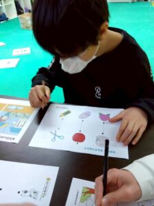 丁寧に線をなぞったり、絵を見比べたりしながら、一つひとつ確認して進めています。